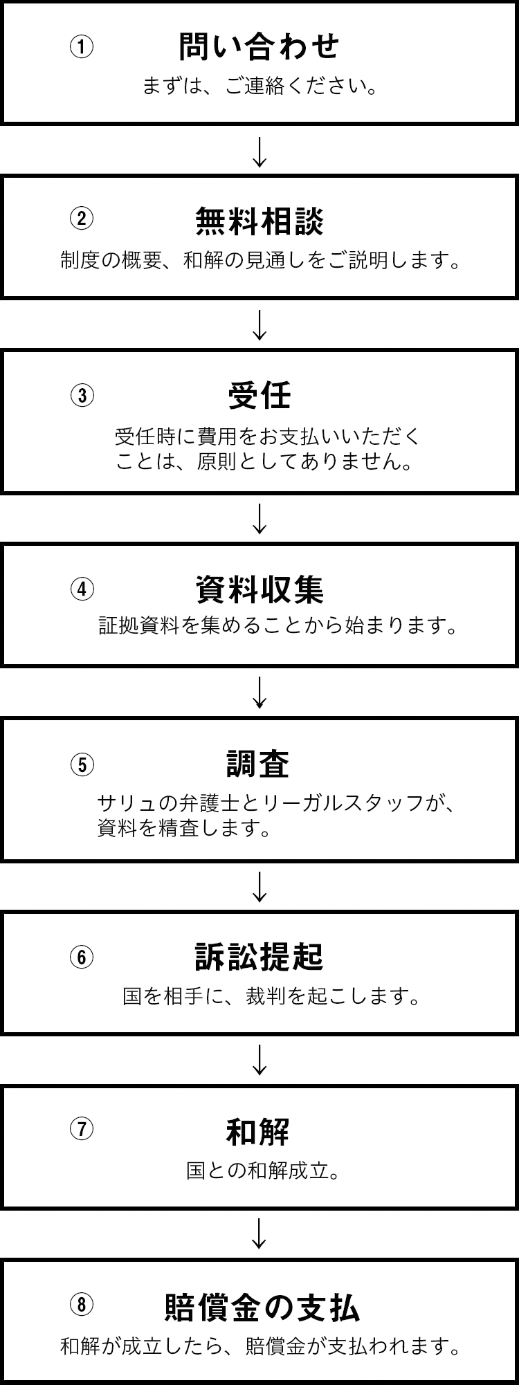アスベスト(石綿)工場の元労働者やそのご遺族の方々が、国に対して訴訟を提起し、一定の要件を満たすことが確認された場合に、訴訟の中で和解手続を進め、国から損害賠償金が支払われる手続です。平成26年10月9日の最高裁判決において、国が規制権限を行使してアスベスト(石綿)工場に局所排気装置の設置を義務付けなかったことが、違法であると判断されました。それを踏まえて、一定の要件を充足する方に対して、最高1300万円の和解金が支払われることが決定しました。